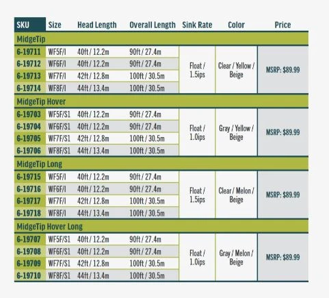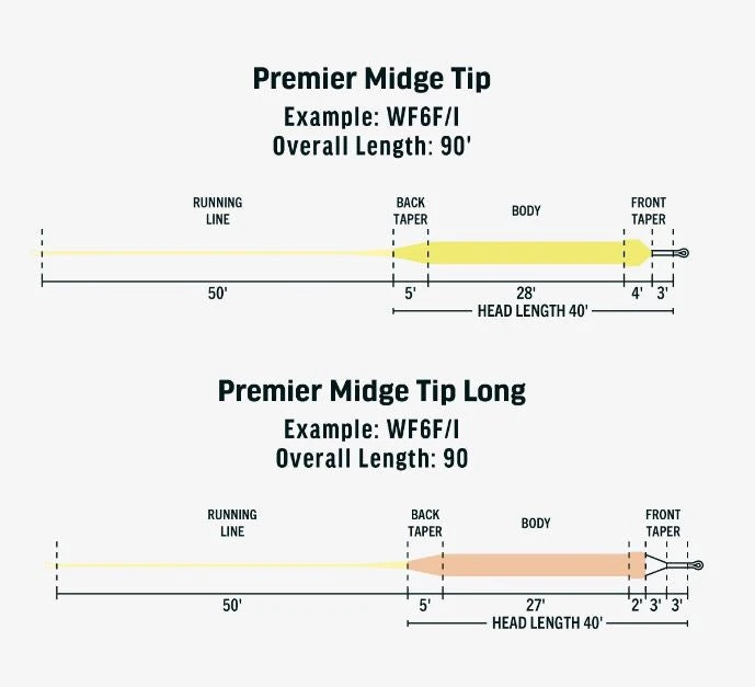 The Premier Midge tip is a floating line with either a 3ft or 6ft long, clear intermediate tip that sinks 1.5 inches per second or a gray hover option that sinks 1 inch per second. This is deadly effective on windy days, when fishing in shallow bays, close to lake shores or over the top of weed beds, and is perfect for fishing nymphs, emergers, and chironomids (buzzers). Each line is built with a supple coldwater core, SlickCast coating, and welded loops on the front and back for fast rigging. With options available in regular and long, hover and intermediate, it is a must have line for lake anglers everywhere.