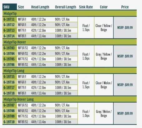 The Premier Midge tip is a floating line with either a 3ft or 6ft long, clear intermediate tip that sinks 1.5 inches per second or a gray hover option that sinks 1 inch per second. This is deadly effective on windy days, when fishing in shallow bays, close to lake shores or over the top of weed beds, and is perfect for fishing nymphs, emergers, and chironomids (buzzers). Each line is built with a supple coldwater core, SlickCast coating, and welded loops on the front and back for fast rigging. With options available in regular and long, hover and intermediate, it is a must have line for lake anglers everywhere.